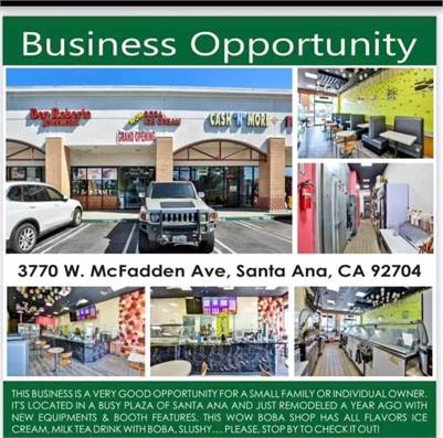 Tiệm bán Boba và Ice Cream góc Habor và McFadden, khu thương mại đông khách,mới remodel toàn diện,1200 Sqt, cần bán gấp, giá có thể thương lượng. L/L: 714-260-1630.