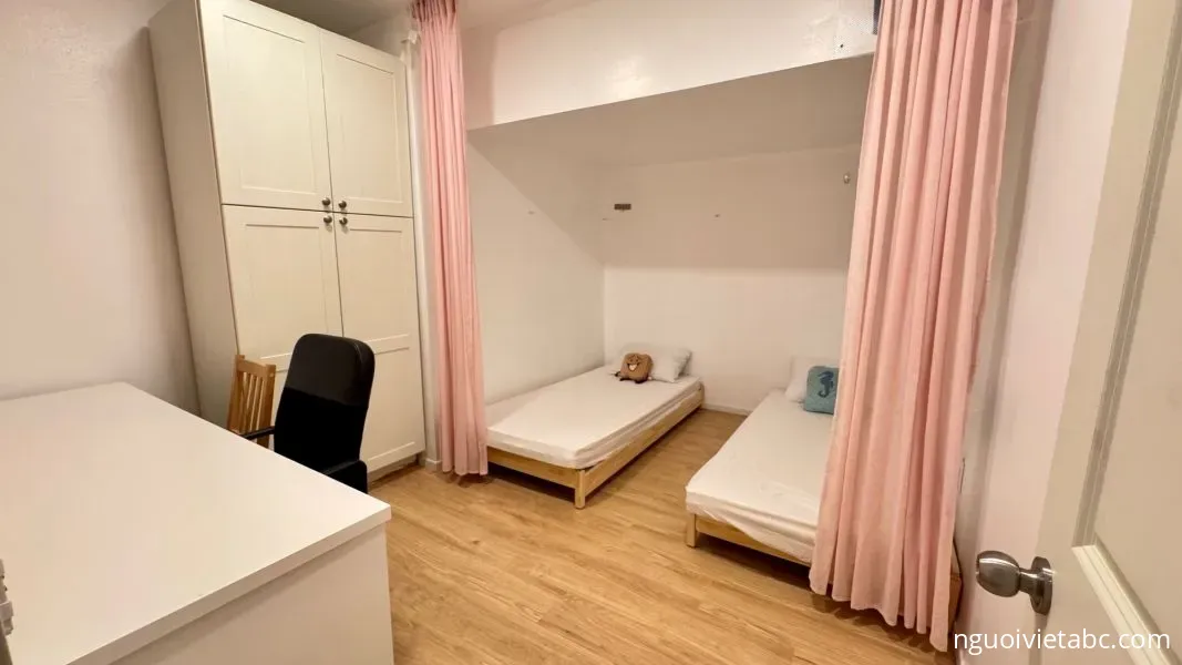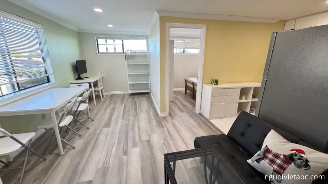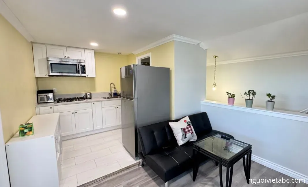 Nhà nhỏ 2 phòng ngủ dưới lầu, 1 phòng ngủ & 1 phòng tắm & bếp & phòng khách trên lầu, giặt sấy riêng, lối đi riêng, đầy đủ nội thất & dụng cụ bếp (air frier, nồi cơm điện, bình đun, nồi chảo, chén đũa…), AC, wifi, TV bao gồm