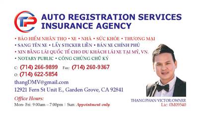DỊCH VỤ DMV *SANG TÊN XE *BẢO HIỂM XẾ * XE RỚT SMOG-CHECK bán chính phủ $1,500. Cấp liền*STICKER *PLATE *Lien-sale* SALVAGED. THẮNG-PHAN: 714-266-9899. TP AUTO REG 12921 FERN ST-G-G/BEACH Sau lưng "B" GAS